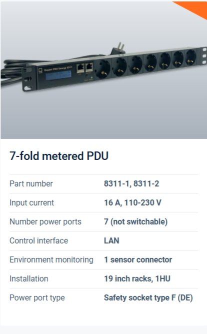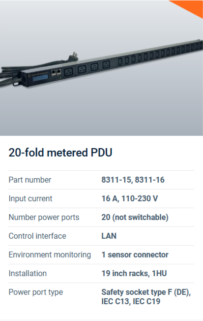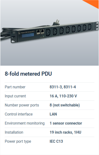 A metered PDU has a detailed power measuring function that can be used to measure up the consumption of the connected devices. These can be measurements of up to 9 electrical quantities such as voltage, current, phase angle, power factor, frequency, active, apparent and reactive power. Read more about the 3 types of metered PDUs here.