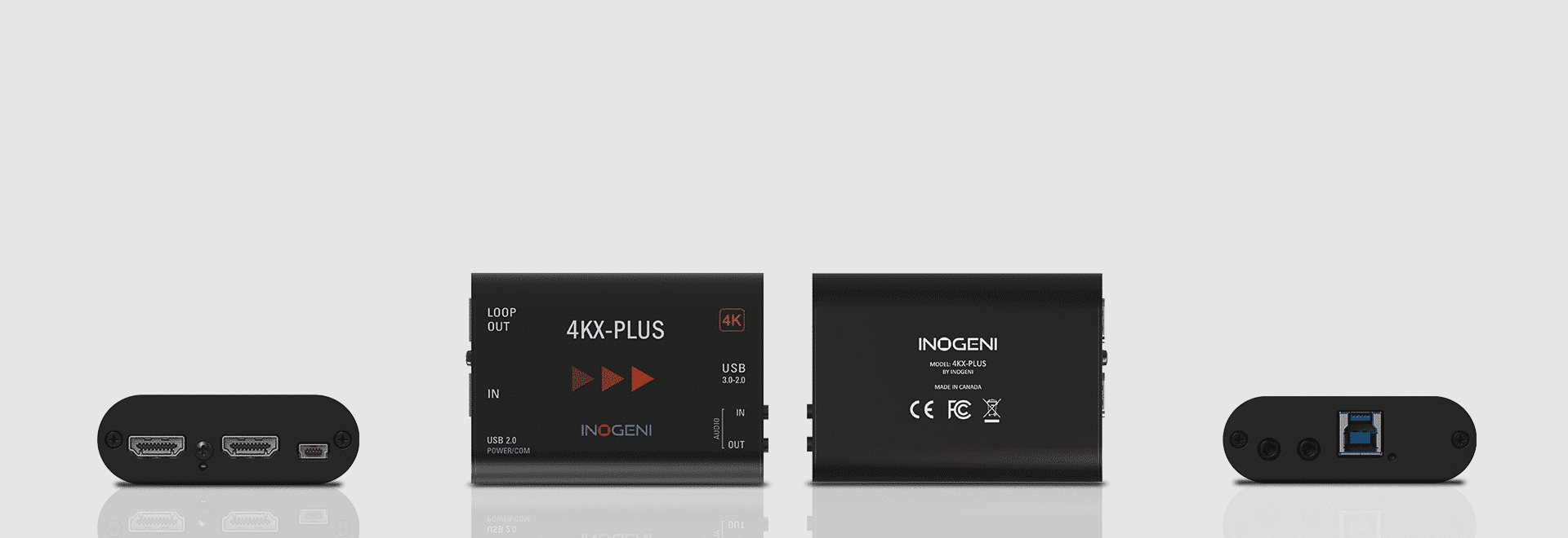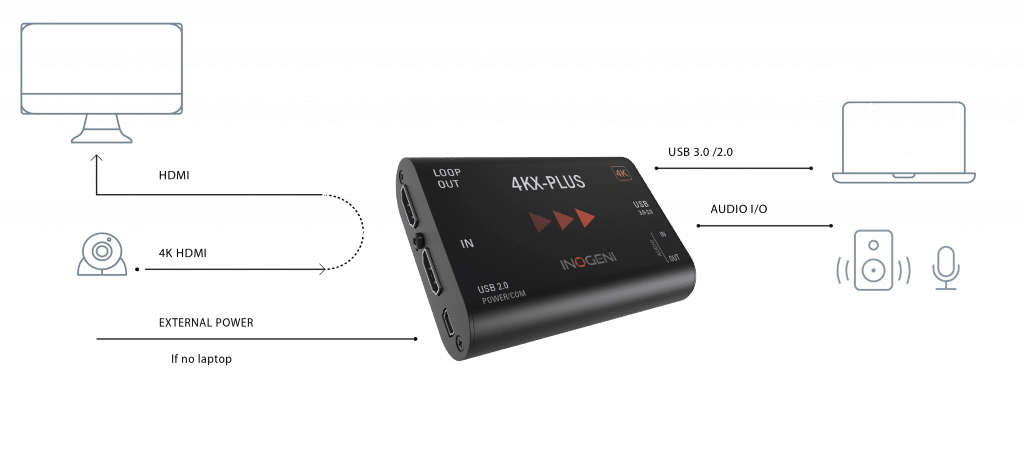 INOGENI’s 4KX-PLUS Ultra HD to USB 3.0 camera converter with an HDMI loop and external power is the most cost-effective and high-performance professional camera converter for your BYOM applications. It connects your HDMI cameras, video sources and CODECS to your laptop.