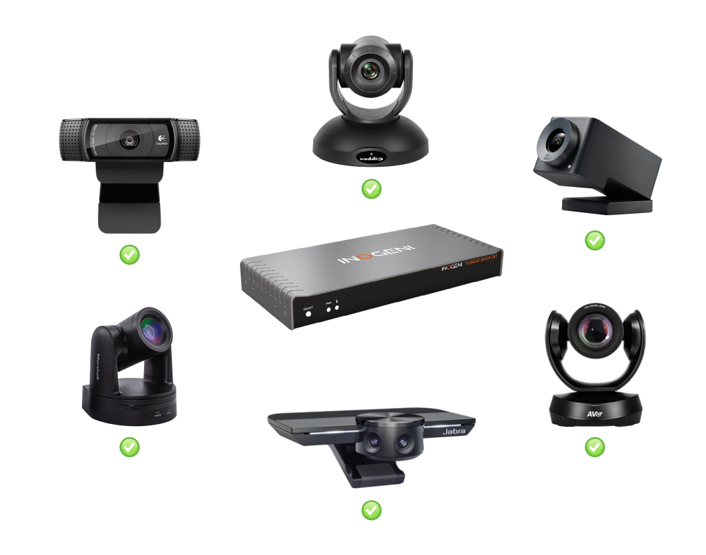 Unlock ultimate versatility with INOGENI’s TOGGLE DOCK 2×1! It is fully compatible with all USB cameras, videobars and pro-AV audio speakerphones, microphones, or speakers, including Vaddio, Huddly, HuddleCamHD, AVer, Jabra, Logitech, Marshall cameras, and web cameras.