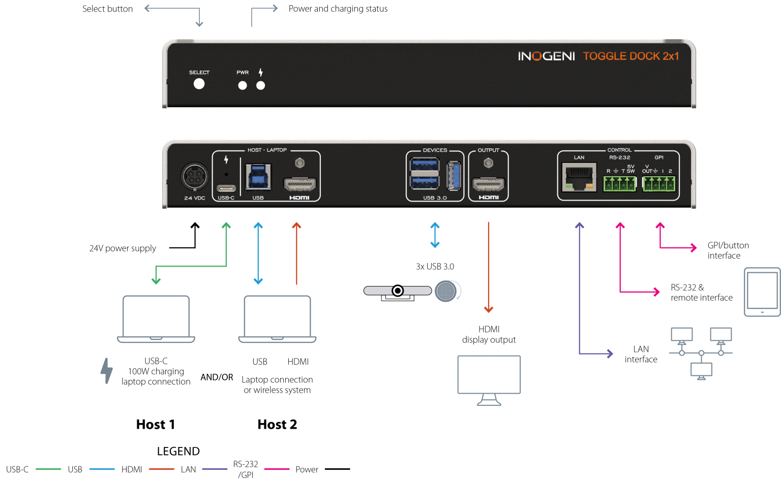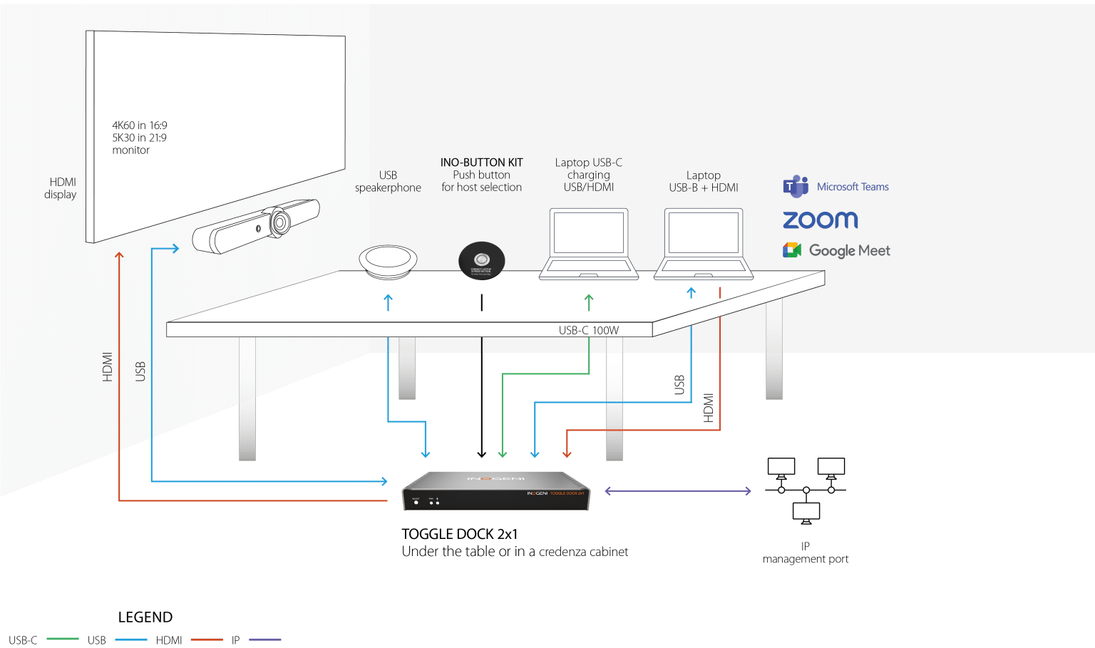 TOGGLE DOCK 2×1 4K60 USB/HDMI switcher effortlessly connects to three USB 3.0 devices and an HDMI display. No Room PC required. Seamlessly switch between 2x hosts provides convenient charging capabilities of up to 100W via USB-C. Run professional-grade video meetings directly from your laptop using your preferred conferencing application—Teams, Zoom, or Google Meet—with seamless AV switching powered by TOGGLE DOCK 2×1. In addition, this versatile solution offers seamless integration with professional AV control systems via RS-232, LAN, API, and GPI, enabling remote management, automated switching, and effortless troubleshooting for a smooth and reliable video conferencing experience.