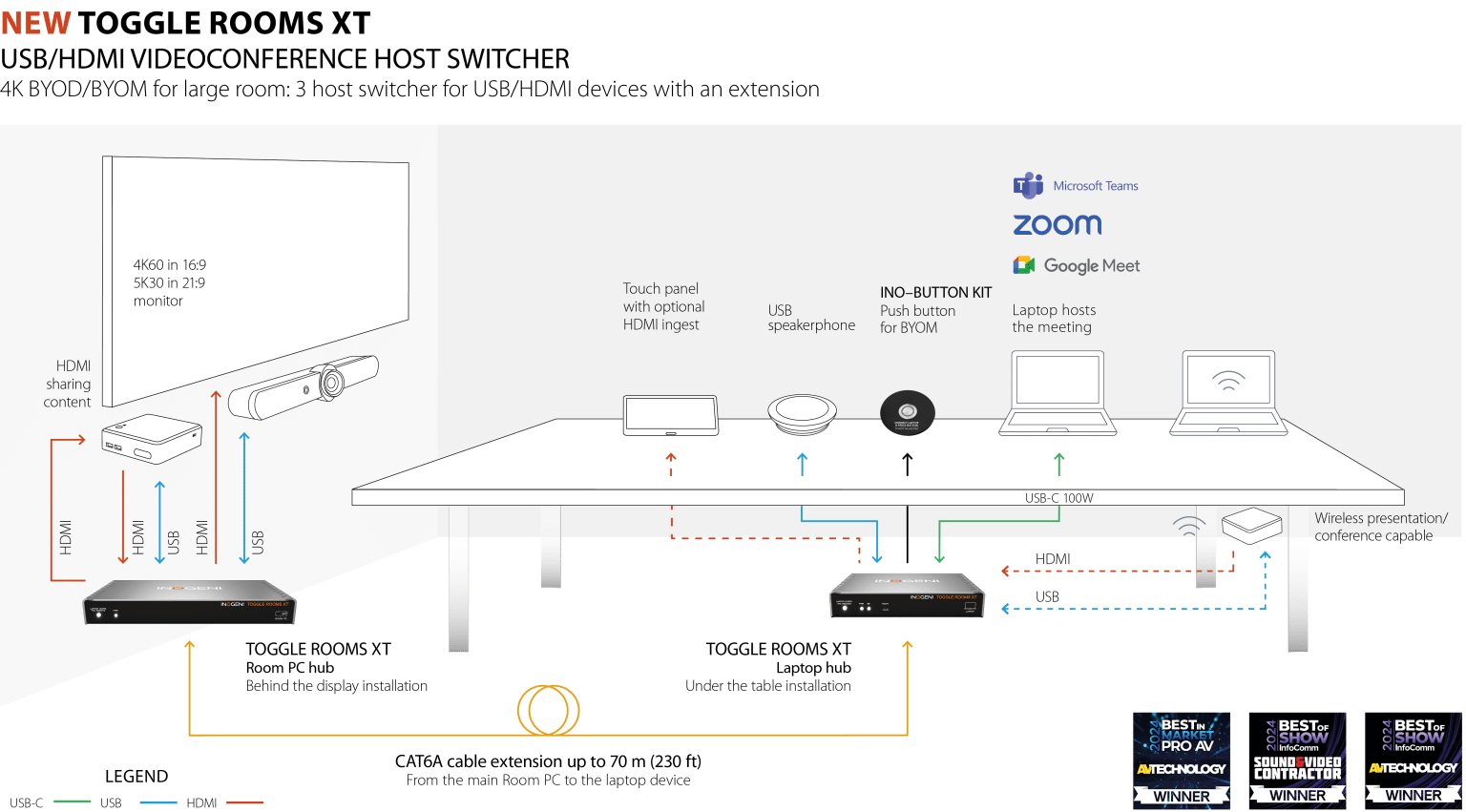 Unlock ultimate versatility with INOGENI’s TOGGLE ROOMS XT! It is fully compatible with all USB cameras, videobars and pro-AV audio speakerphones, microphones, or speakers, including Vaddio, Huddly, HuddleCamHD, AVer, Jabra, Logitech, Marshall cameras, and web cameras.