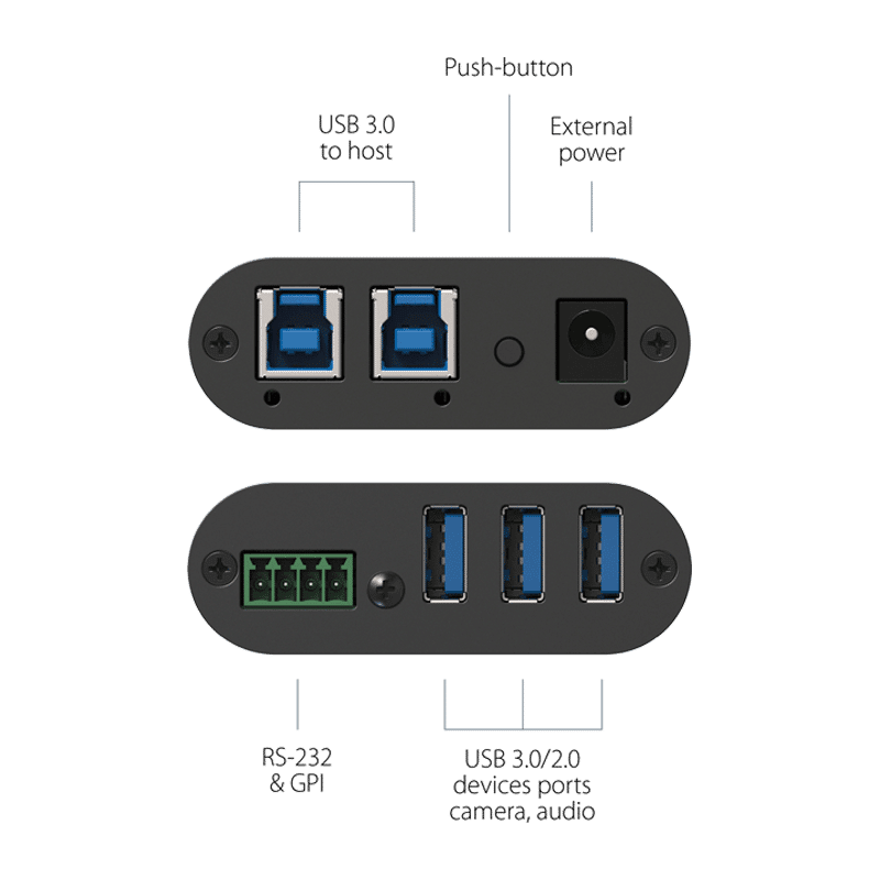 TOGGLE USB Switcher connect to three USB 3.0 devices and can switch them between two hosts. It will switch automatically to a laptop when it is connected, and revert back to the room pc when disconnected. It can also be controlled remotely by RS-232 or GPI. -