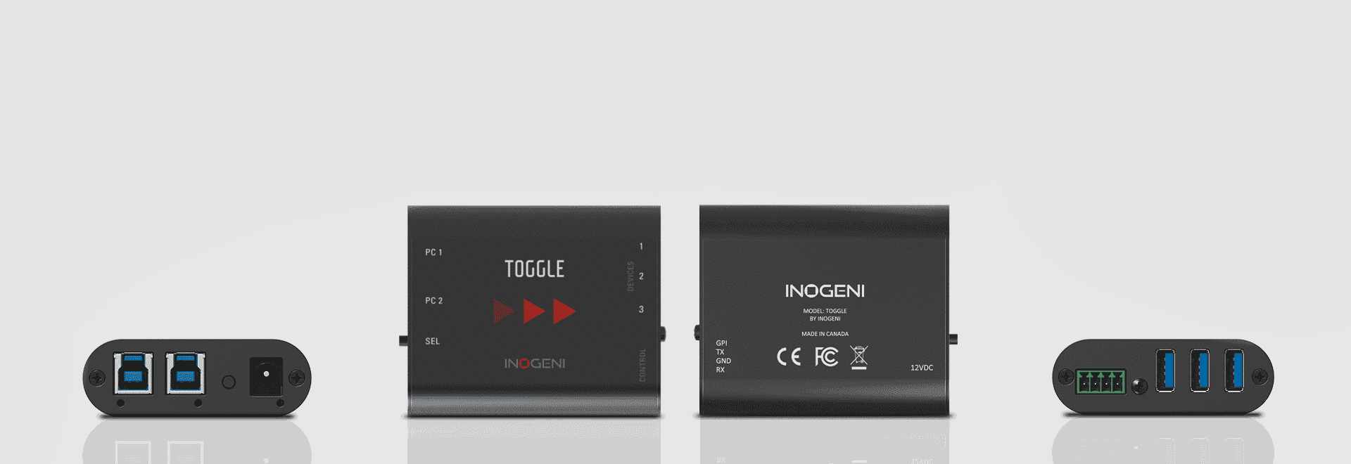 The TOGGLE USB 3.0 switcher offers an array of features for a smooth and seamless BYOD or BYOM experience:Three USB 3.0 device portsAutomatically switch between two USB 3.0 hostsCompatible with USB 2.0Automatic, manual or remote controlRS-232 controlGPI controlRugged full-metal enclosureExternal power supply can provide power to USB 3.0 devicesTwo USB 3.0 cables includedDevice configuration via the INOGENI Control AppFirmware upgrade available via the INOGENI Control AppCompatible with Barco ClickShare Conference (CX-20, CX-30 & CX-50)