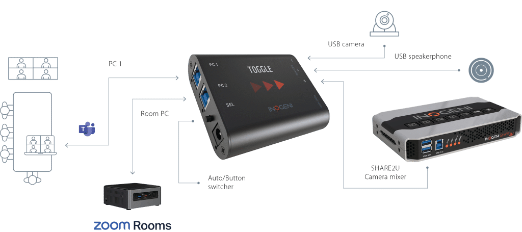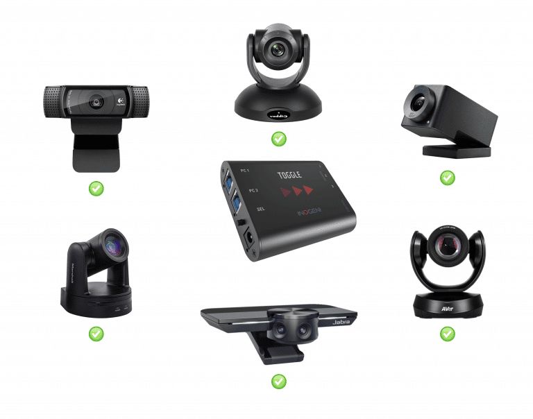 INOGENI’s TOGGLE USB 3.0 PRO AV switcher allows anyone in a conference room to access high-quality USB devices (cameras, microphones) in mere seconds.