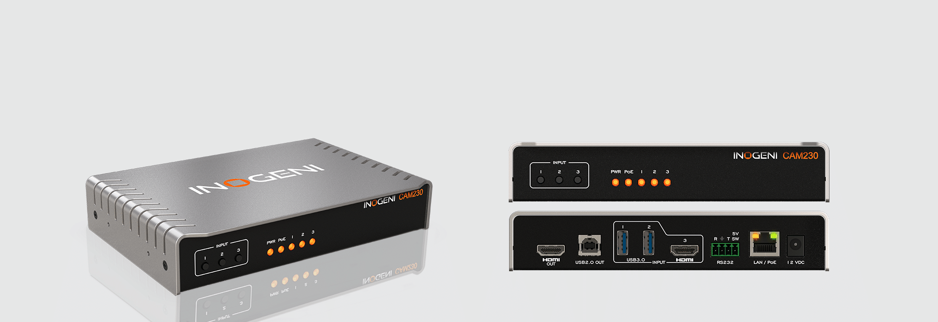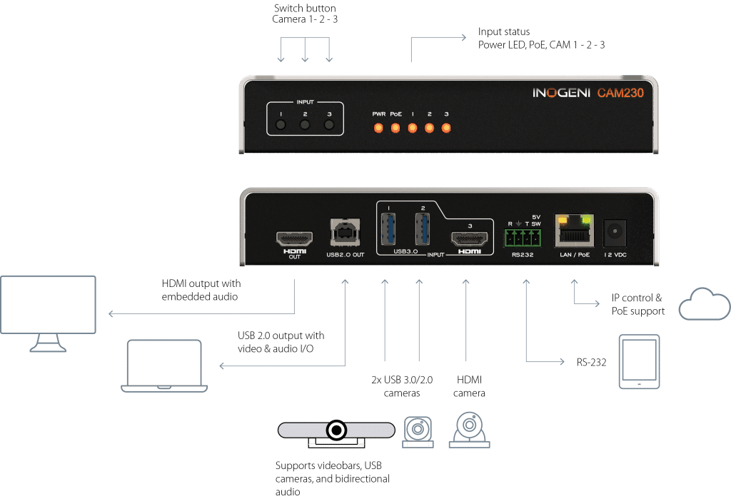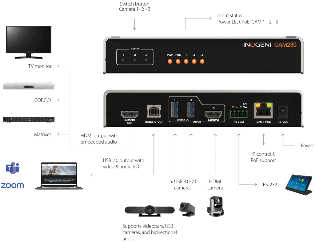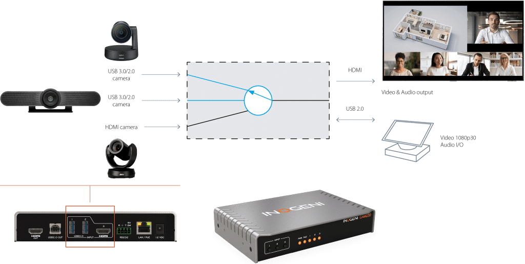 The INOGENI CAM230 is a multi-camera switcher that allows users to easily switch between up to three video cameras during a virtual meeting or presentation. The CAM230 connects to 2x USB 3.0/2.0 cameras and 1x HDMI camera and outputs a single video stream on USB 2.0 MJPEG and HDMI 2.0. With its easy-to-use push-button or via control pad switching, facilitators can ensure all participants are given equal opportunities to speak and contribute to the conversation while supporting whiteboard and document cameras for added collaboration and productivity.
