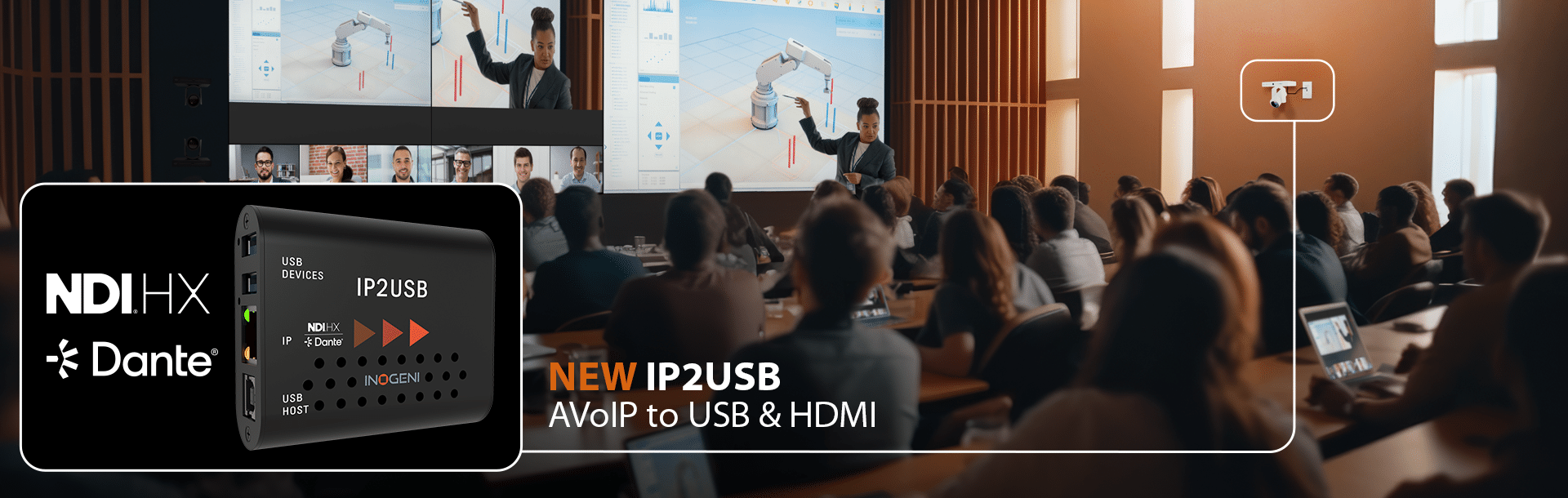 The INOGENI IP2USB is a specialized converter and switcher that enables users to connect NDI or RTSP IP-based cameras and Dante audio to USB peripherals, eliminating the need for costly USB extenders. It bridges IP cameras with your favorite web communication platform, delivering a cost-effective way to integrate cameras and audio devices.