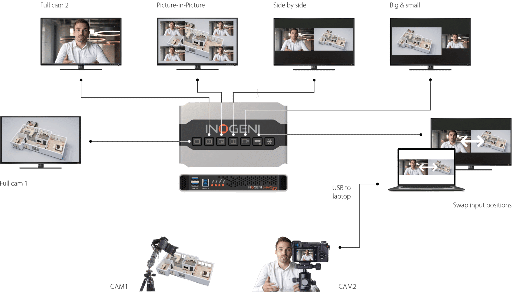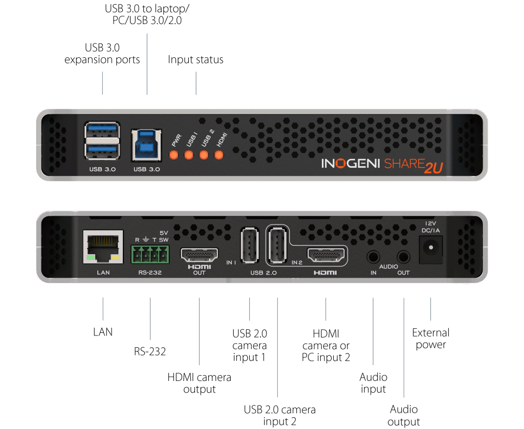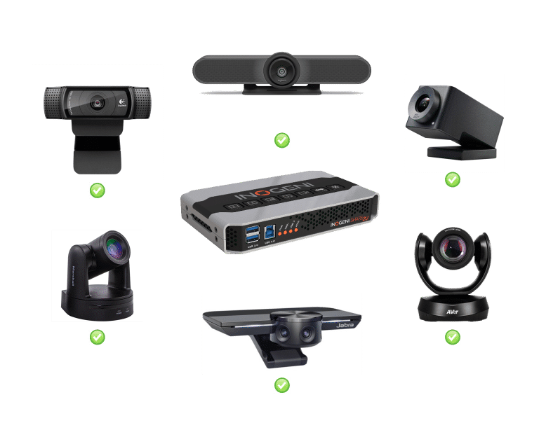 1x USB camera (1080p or higher) connected to the SHARE2U HDMI input via the INOGENI U-CAM converter (4K USB to HDMI converter)