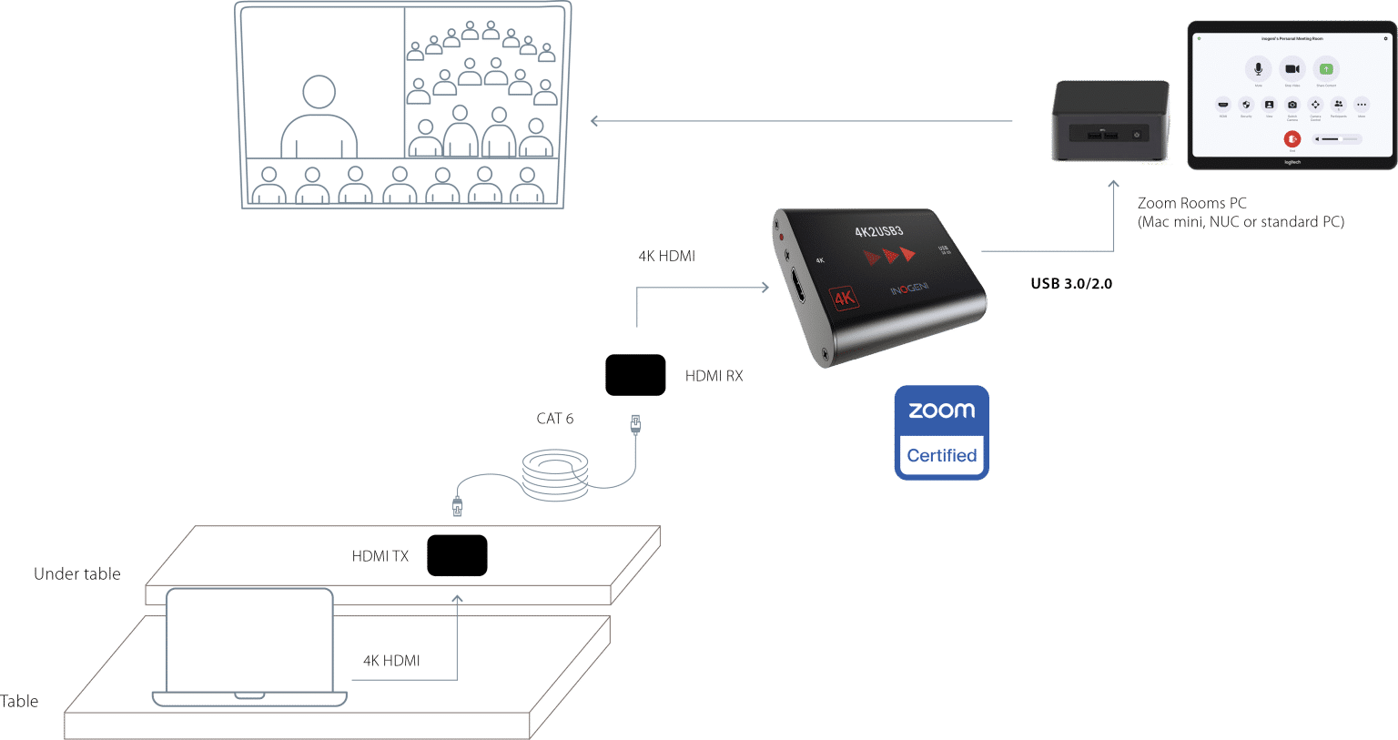 The (HD2USB3 or 4K2USB3 or 4KX-PLUS) is recognized by any computer or videoconferencing platform as a standard USB camera. This makes it incredibly flexible: connect an HDMI video camera and it works as a camera converter. Using Zoom Rooms, you can connect a laptop through HDMI to the device and it will act as a content source.