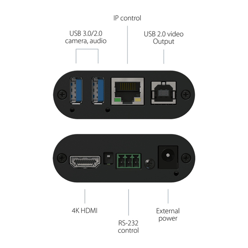 Convert uncompressed 4K (up to 30fps) USB 3.0/2.0 video camera and audio signals to an HDMI output (CODEC, Matrix, or Display) with embedded audio. IP and RS-232 control.
