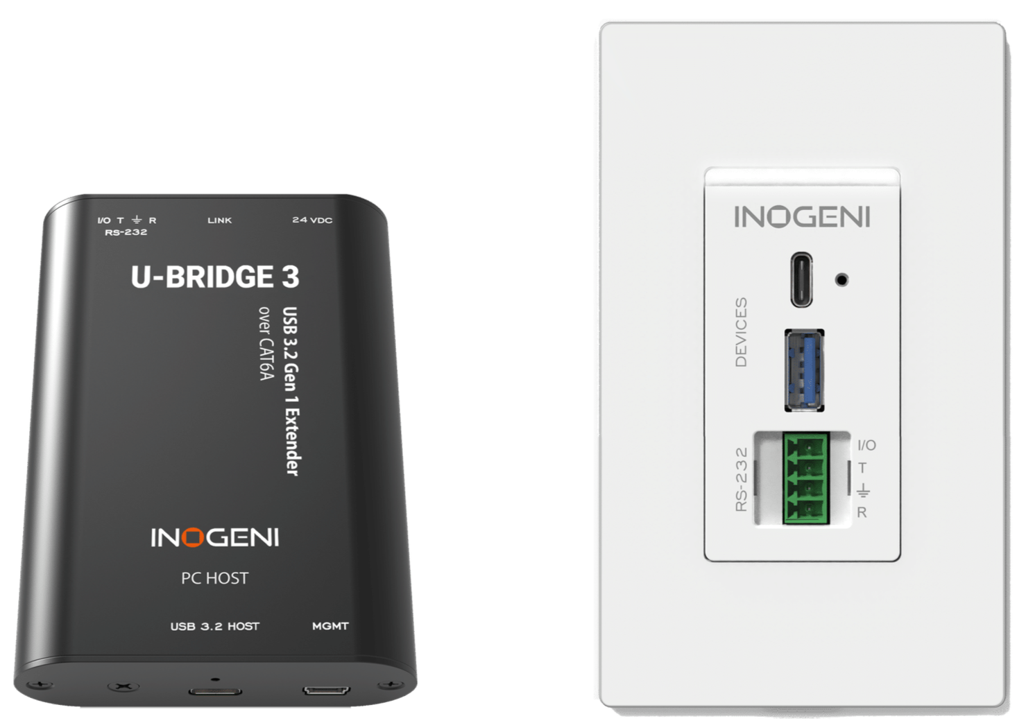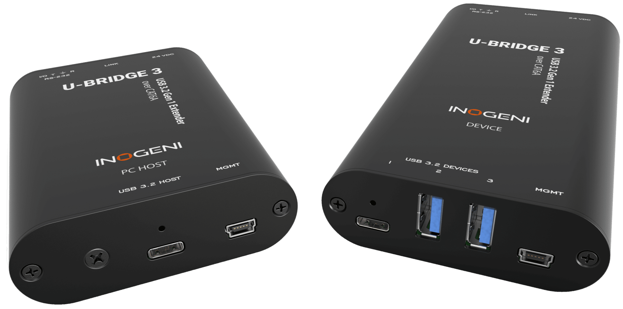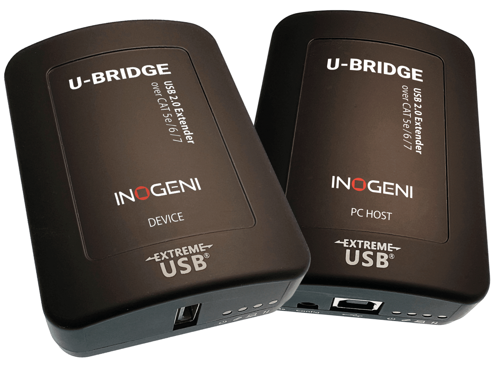 The INOGENI U-BRIDGE USB 2.0 extender for cameras and any USB 2.0 device is the problem-solver to interoperability challenges faced by AV installers looking for a reliable long-distance USB camera extension while maintaining high-quality video. The U-BRIDGE USB 2.0 video camera and audio extender enables high-speed USB 2.0 connections up to 100 m /330 ft. over a single CAT 5e/6/7 cable.
