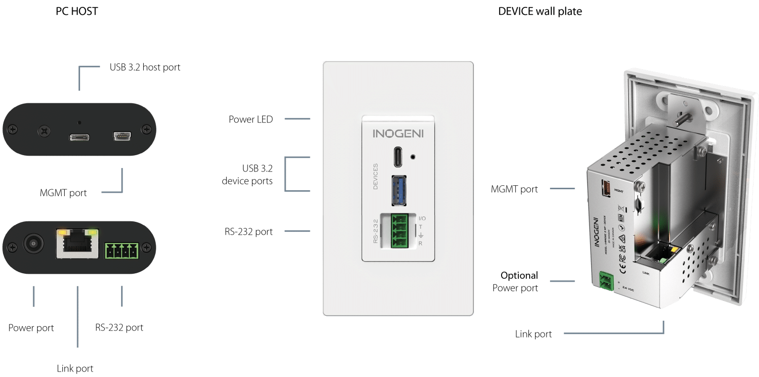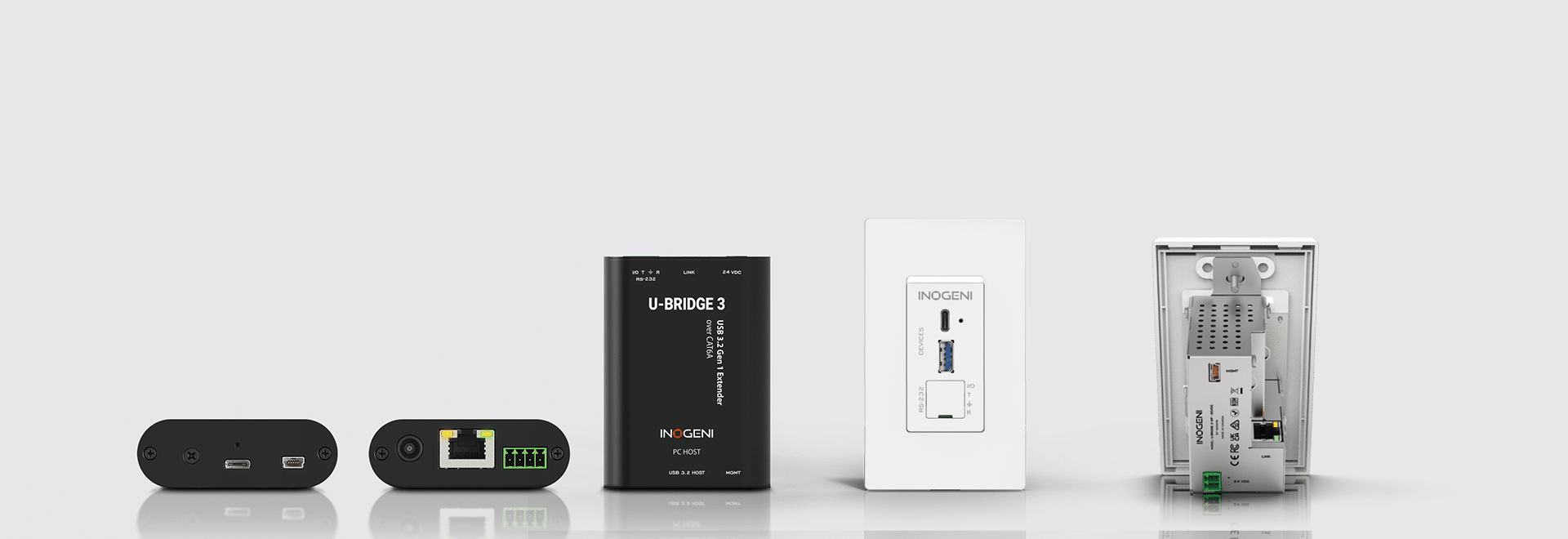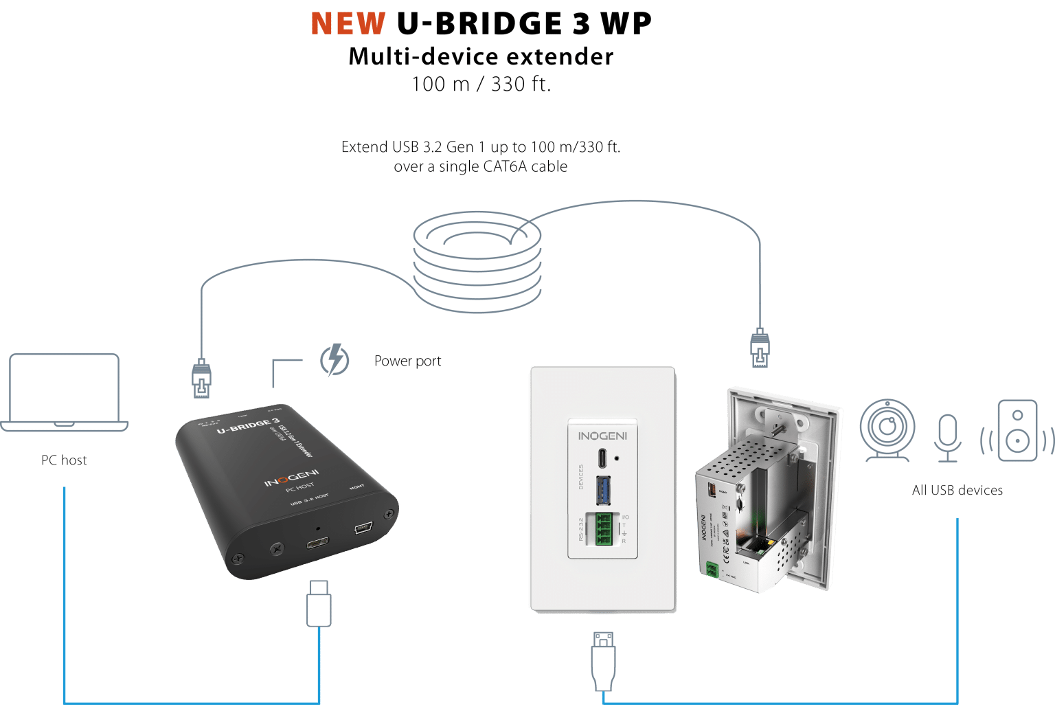 The new INOGENI U-BRIDGE 3 WP multi-device extender with a wall plate for any USB 3.0 device is the solution to interoperability challenges AV installers encounter when reliable long-distance USB camera extension is required. The U-BRIDGE 3 WP video camera and audio extender enables SuperSpeed USB 3.0 connections up to 100 m/330 ft. over a single CAT6A U/FTP cable.
