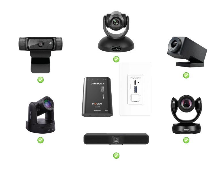 The U-BRIDGE 3 WP is fully compatible with all USB cameras (USB3/5 Gbps and is backward-compatible with USB 2.0), including professional-grade equipment, such as AVer, Logitech, Jabra, ClearOne, Huddly, HuddleCamHD, PTZOptics, Lumens, Marshall, and web cameras.