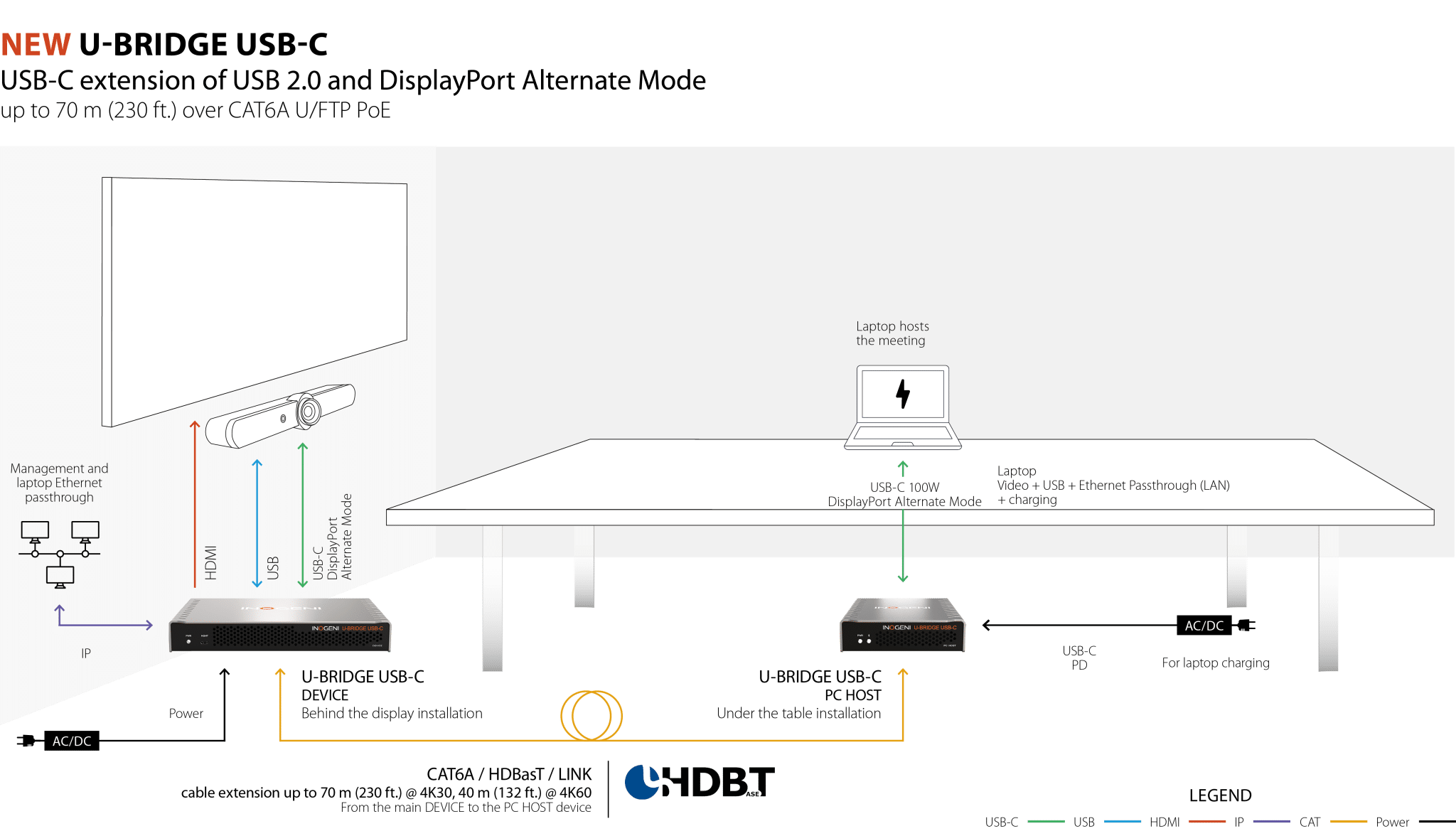 The U-BRIDGE USB-C extender is specifically designed to extend USB-C functionality, including USB data, DisplayPort Alternate Mode, power, and Ethernet, from your laptop to your USB-C-equipped videobar or CODEC. With the capability to extend connections up to 70 meters (230 feet) over a single CAT6A cable, it guarantees reliable performance and high-quality, uncompressed video at 4K60 HDMI output.