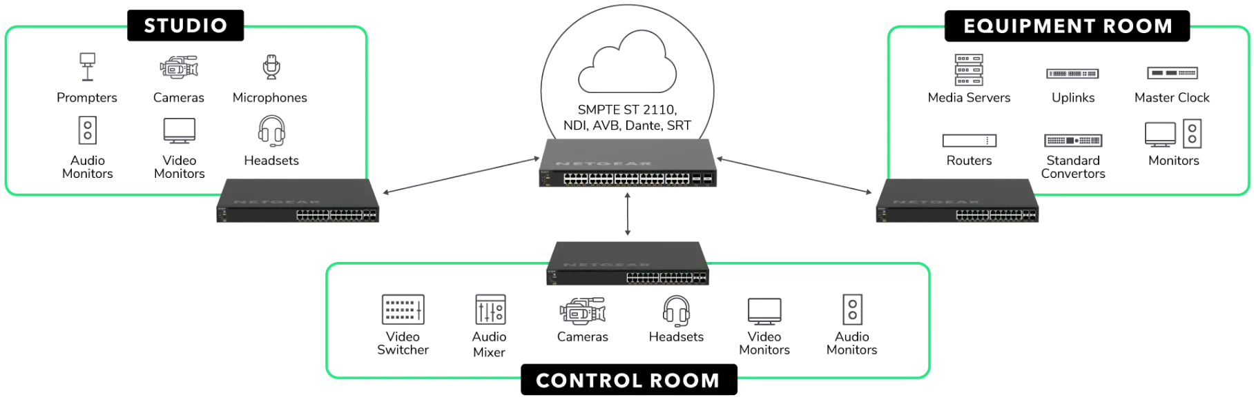 Typical network sending audio, video, control, lighting, and other networking over standard Ethernet via NETGEAR managed switches.
