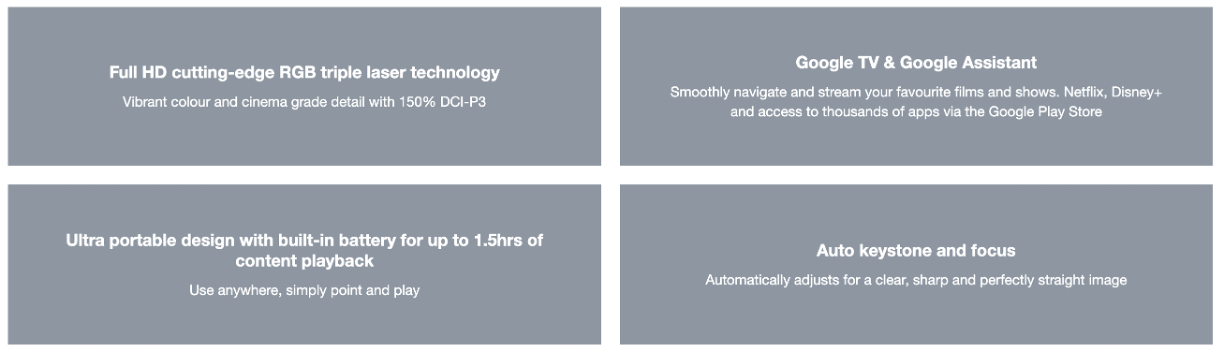 Featuring the latest RGB laser technology, the Photon Go provides stunning 150% DCI-P3 cinema-grade colour accuracy for up to 20,000 hours of vibrant, uninterrupted viewing - and with Google TV at your fingertips, you can dive straight into your favourite apps and shows, right out of the box.