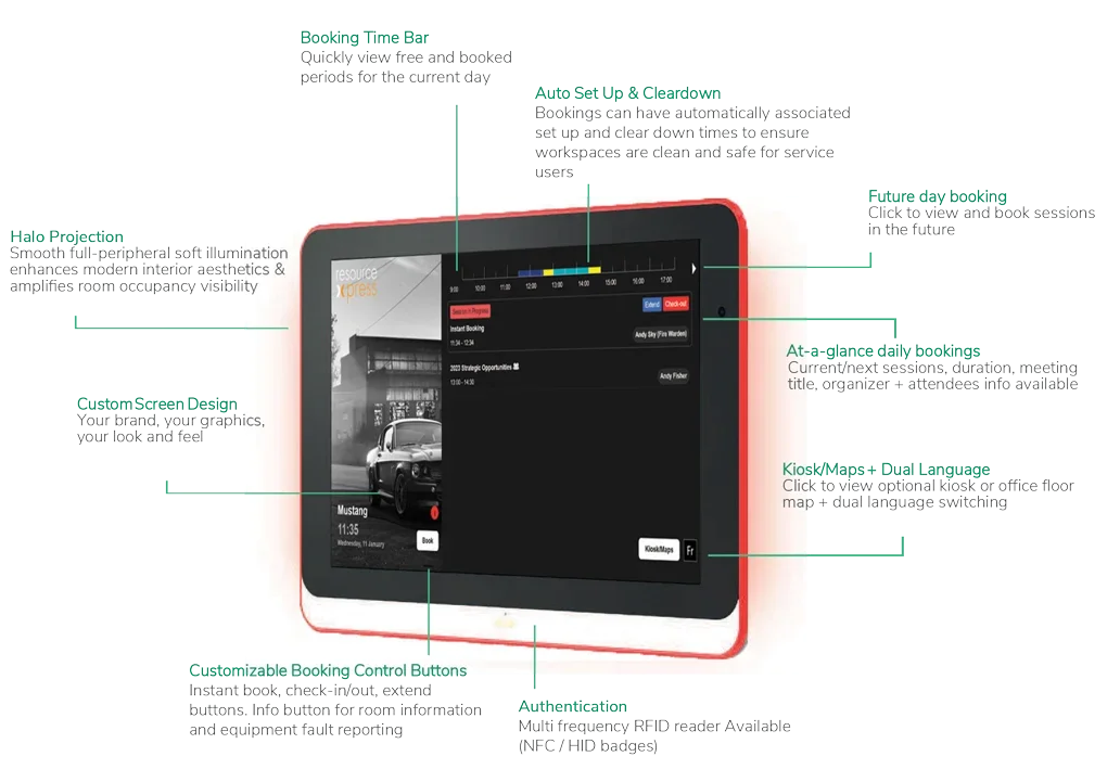 Installed with the clever ResourceXpress Aura meeting room screen firmware and client software you can be assured that this screen will provide a feature rich meeting room booking experience.