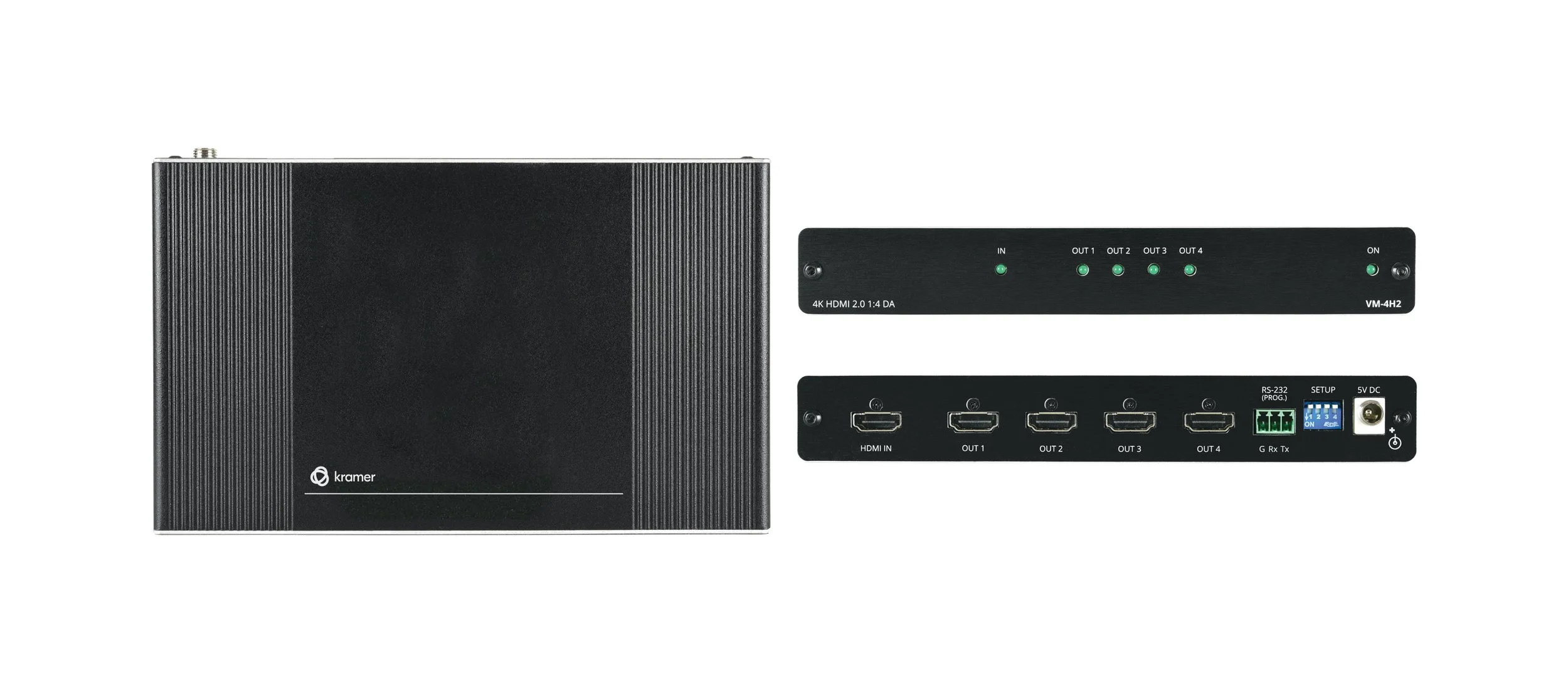 VM−4H2 is a 1:4 distribution amplifier for up to 4K HDR, HDMI signals that comply with HDCP 2.2 content protection standard. The unit takes one HDMI input, equalizes and reclocks the signal and distributes it to four identical outputs.