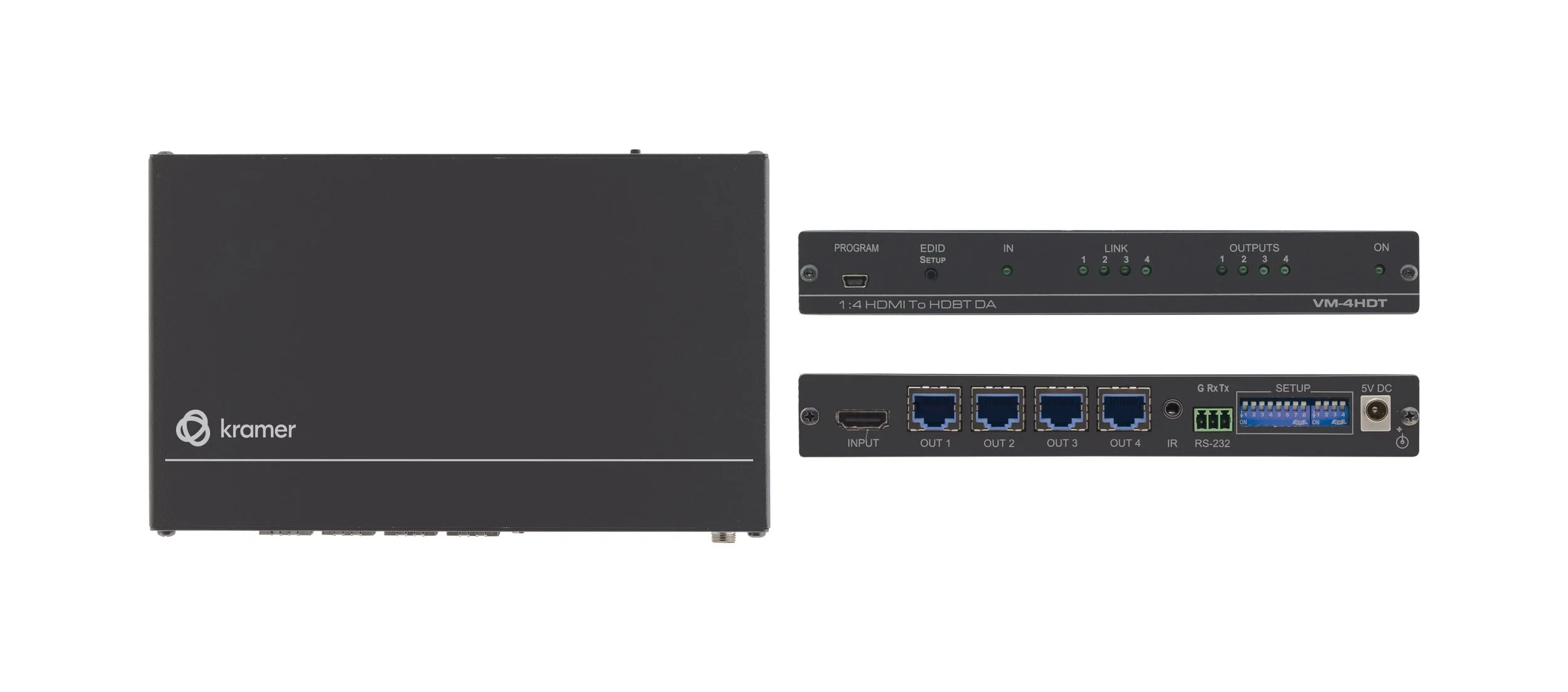VM−4HDT is a high−quality, long−reach 4K@60Hz (4:2:0) HDBaseT extender distributor that takes one HDMI input, with IR and RS−232 control signals, converts them to HDBaseT extension line signal and distributes it to four HDBaseT outputs that connect to compatible HDBaseT receivers.