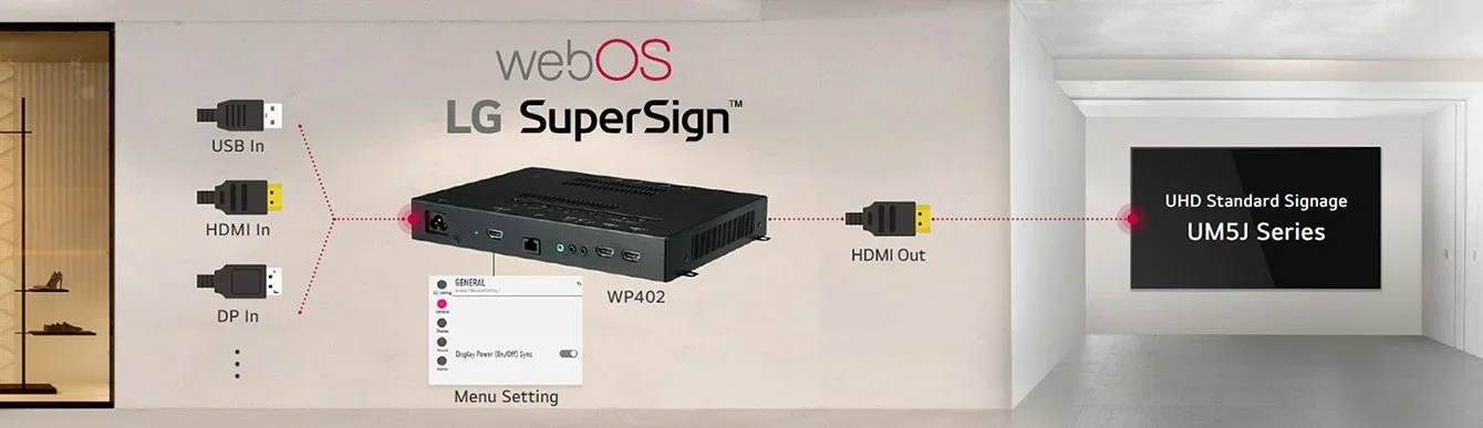 UM5J is compatible with the webOS Box WP402 and it supports LG SuperSign Solutions when used in conjunction with the box, making content creation and distribution easier. Furthermore, thanks to its compatibility with WP402, UM5J enables display power on/off control through an HDMI-OUT port when connected to the WP402.