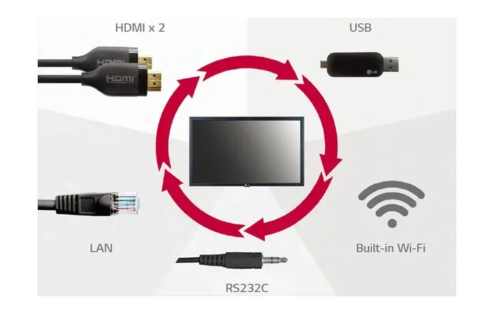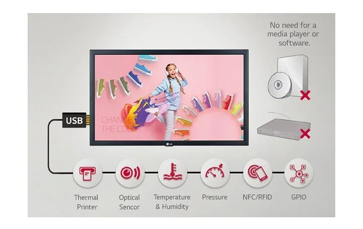 LG webOS smart signage platform easily supports connections with external sensors such as GPIO, NFC/RFID, temperature sensors, etc, via USB plug-in. The overall cost for maintenance is reduced as there's no need to purchase additional software or media players.