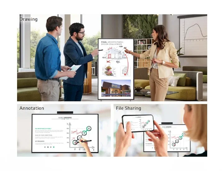 With LG One:Quick Flex's 43-inch all-in-one display complete with built-in camera, microphones and speakers there's no need to stress over online meetings and calls and no more inconvenience of connecting to and setting up video conferencing.