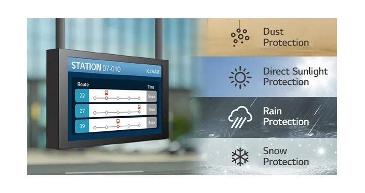 The display is sealed with IP56 design for reliable operation. It’s designed to be not only waterproof but also weatherproof against the damaging effects of the sun, rain, snow, dust and wind, which is an essential feature for outdoor application.